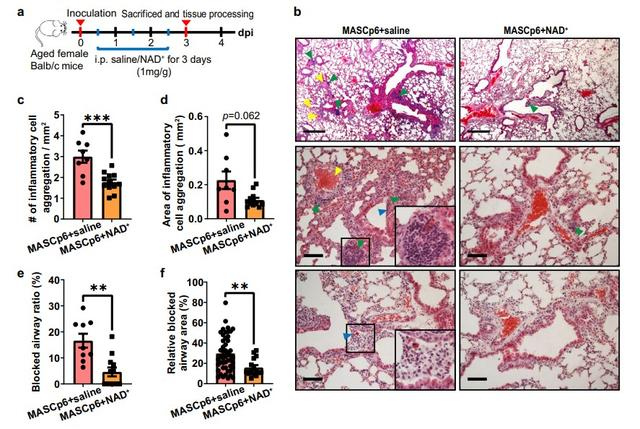 2022年4月29日,中科院联合北京大学与清华大学在国际科学期刊《Cell Discovery》发表了题为“Treatment of SARS-CoV-2-induced pneumonia with NAD+ and NMN in two mouse models”的最新临床前研究,研究证明补充NAD+前体NMN可治疗新冠病毒感染导致的基因表达和代谢紊乱,从而挽救新冠小鼠的生命。