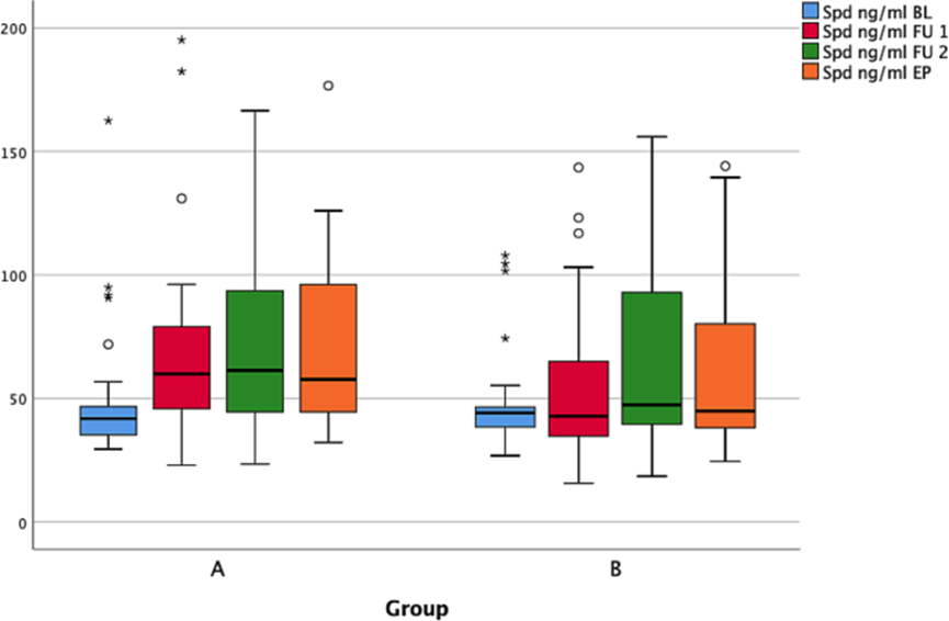 针对A组给与每片亚精胺含量为3.3mg的面包片,针对B组给与每片亚精胺含量为1.9mg的面包片。在3个月的研究期间,A组的参与者平均消耗了238毫克亚精胺,而 B 组的参与者平均消耗了137毫克亚精胺。口服更高剂量亚精胺的A组,血液里的亚精胺浓度也会有适当的增加。
