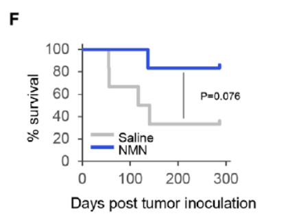 于是研究团队通过补充NAD前体NMN发现,NMN提升了NAD水平并有效缓解巨噬细胞衰老,防止T细胞功能障碍。并且在免疫活性小鼠的肿瘤模型中,对照组约70%的小鼠出现肿瘤并因此死亡,而NMN治疗组仅有约20%的小鼠观察到肿瘤,并且小鼠的存活率也有所提高。这说明NMN可以抑制肿瘤的出现和发展,使癌症发病率降低约71.4%,并且提高存活率。