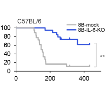 (敲除IL-6因子后,肿瘤小鼠(蓝色)的存活率大大提升